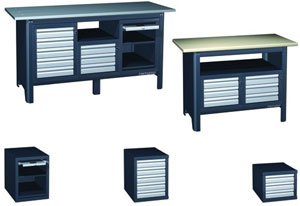 Максимально допустимая равномерно распределенная нагрузка на столешницу составляет 1000 килограммов; нагрузка на крышку тумбы – 600 кг; на полку и ящик – по 50 кг, при этом для ящиков серии Titan используются направляющие из стали толщиной 1,5 мм на развернутых подшипниках, обеспечивающие плавное выдвижение даже при полной загрузке.