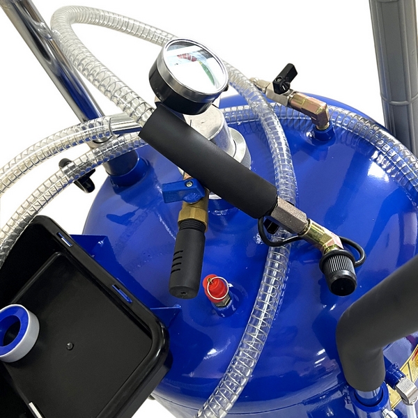 - опустошение емкости для дальнейшей утилизации жидкости происходит при помощи полимерного шланга с жестким носиком и сжатого воздуха (0.6–0.8 бар) от внешнего источника – подключение осуществляется к штуцеру, расположенному сверху;