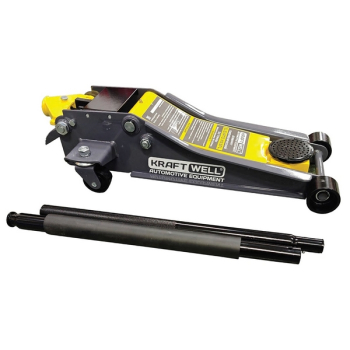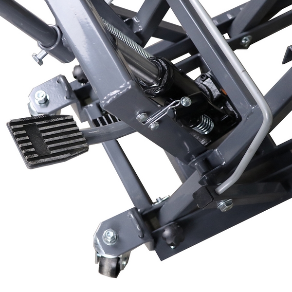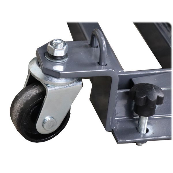 - 2 фиксированных и 2 поворотных колеса, а также эргономичная ручка обеспечивают домкрату мобильность.