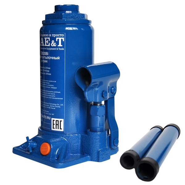 Обладающий грузоподъемностью в 8 тонн гидравлический домкрат бутылочного типа AE&T предназначен для подъема и временного удержания на высоте автотранспорта и другой техники, оборудования, различных конструкций и т.д.