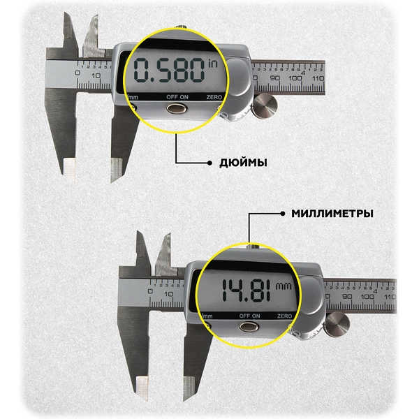 - корпус штангенциркуля и измерительные губки выполнены из прочной нержавеющей стали, измерительный блок – из цинкового сплава;