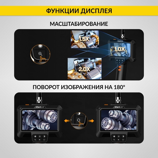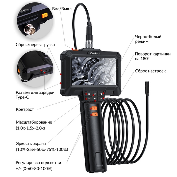 Промышленный эндоскоп iCartool предназначен для дистанционного визуального инспектирования без разборки узлов и механизмов автомобильного транспорта, элементов промышленного оборудования, объектов ЖКХ, строительных конструкций и иных труднодоступных мест и т.д.