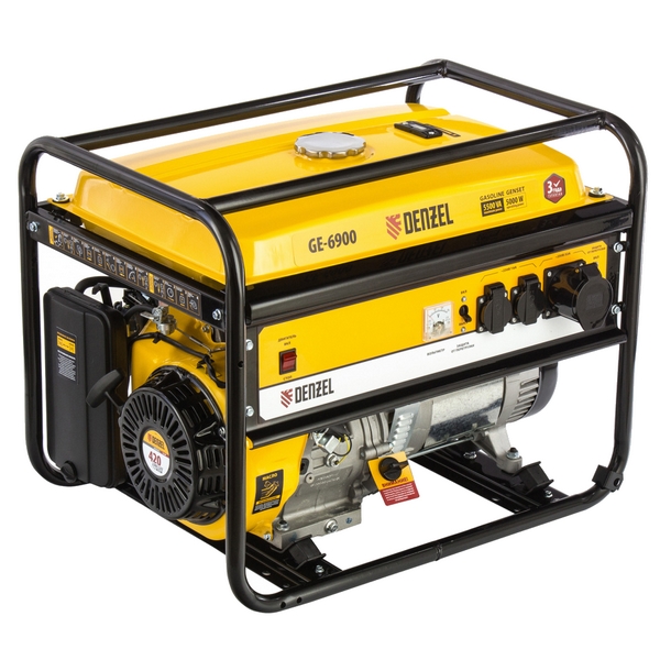 Бензиновый генератор максимальной мощностью 5,5 кВт и с ручным стартом Denzel GE 6900 предназначен для снабжения электроэнергией (230 В) различных потребителей при отсутствии стационарной электросети, а также в качестве резервного источника питания.