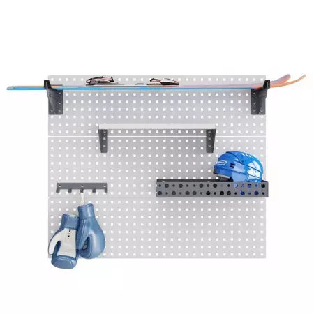 - комплект состоит из 2 размещенных горизонтально перфорированных панелей, 2 держателей, 1 лотка, 1 навесной полки и 1 вешалки;