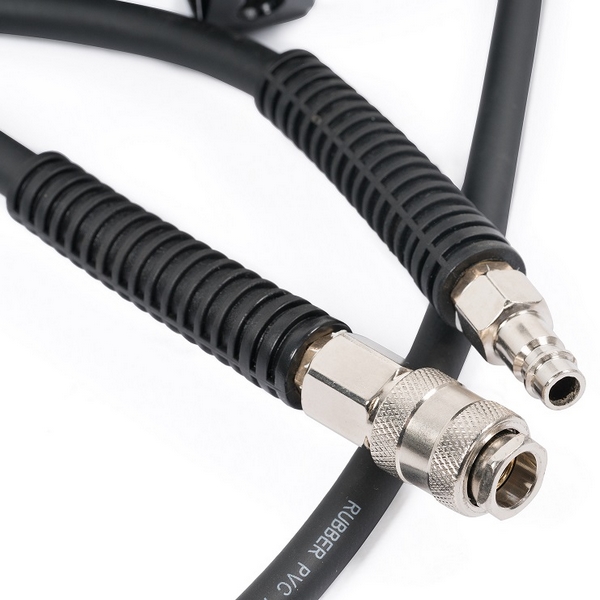 Подвижная часть шланга, выходящая из катушки и подключаемая к инструменту, может вытягиваться на необходимую длину и фиксироваться в таком положении. На концах шланга установлены резьбовые наконечники 1/4" и быстросъемные соединения. Шланг рассчитан на рабочее давление воздуха 20 бар и температуру до 60 °С.
