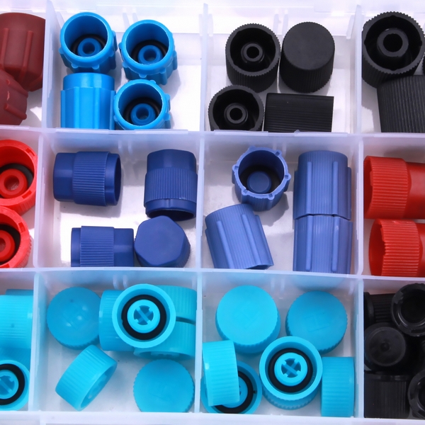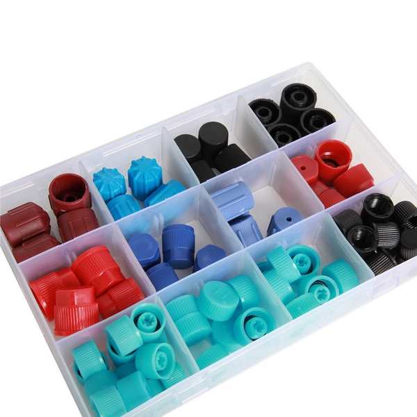 Специализированные колпачки для заправочных штуцеров низкого давления с буквой "L" и высокого давления с буквой "H" применяются при обслуживании и заправке системы кондиционирования автомобилей. Набор поставляется в практичном пластиковом боксе.