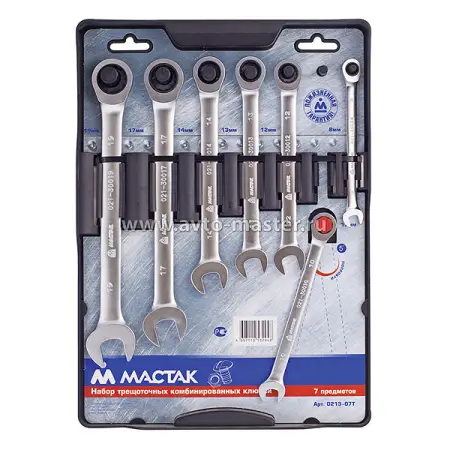Набор ключей трещоточных комбинированных из 7 предметов Мастак 0213-07T составлен из слесарного инструмента профессионального качества, имеющего расширенную гарантию, и может быть использован для ремонта автомобиля. Набор размещается в чехле из винилкожи с прозрачными отделениями для ключей.