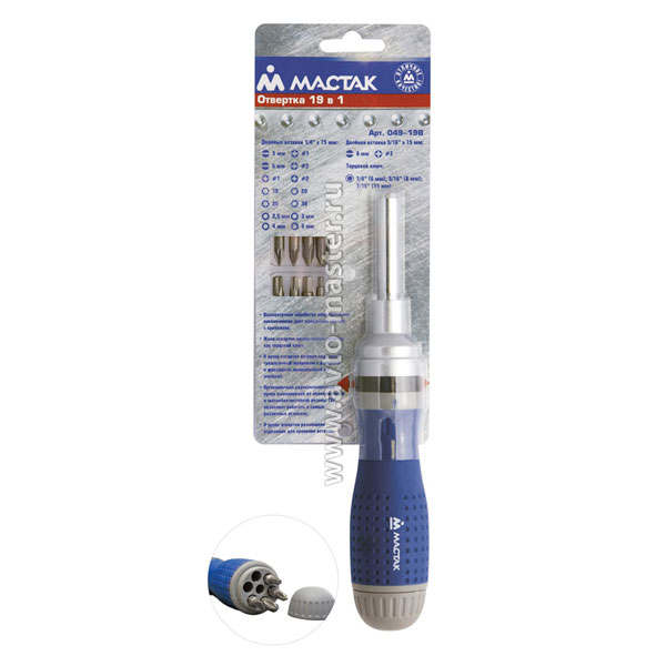 Особенности отвертки со сменными вставками Мастак 049-19B: