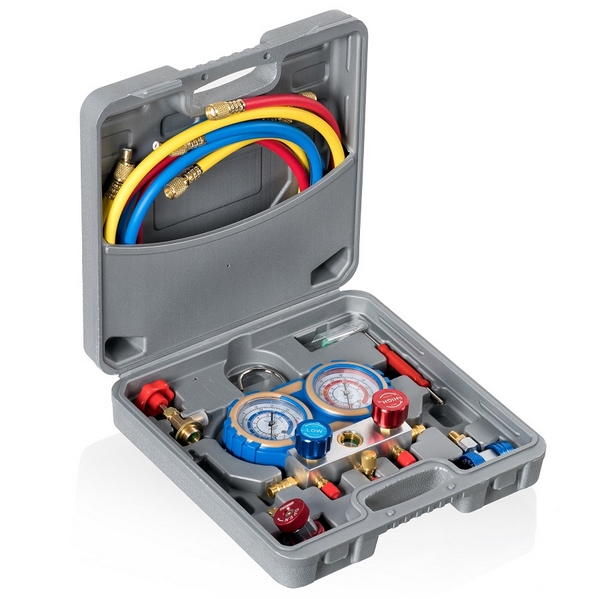 - комплект может использоваться для работы с различными типами фреонов (хладагентов) – R134a, R410a, R407c, R22;