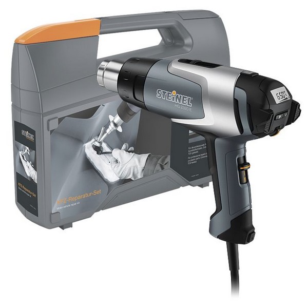 Профессиональный набор для ремонта автомобильных бамперов с термовоздуходувкой Steinel HG 2320E мощностью 2300 Вт в пластиковом кейсе. Применяется в автосервисах и специализированных мастерских.