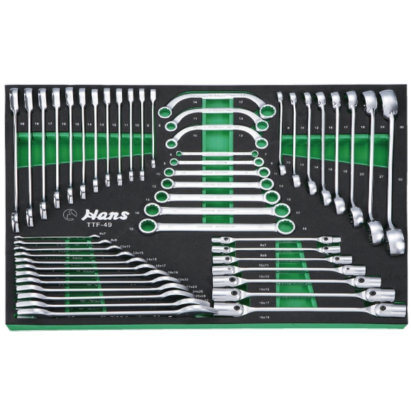 Расширенный по составу набор гаечных ключей разных типов Hans, размещенный в ложементе, предназначен для укомплектования инструментальных тележек и ящиков. Используется для проведения монтажно-демонтажных работ с резьбовыми соединениями при ремонте и обслуживании авто-, мото- и другой техники, различного оборудования, конструкций и т.д.