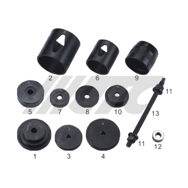 Набор специальных инструментов JTC предназначен для снятия и установки передних сайлентблоков подрамника автомобилей BMW в кузове E39, а также задних сайлентблоков подрамника на E39 и E38. Сфера применения: профильные и универсальные автосервисы и автомастерские, СТО и т.д.