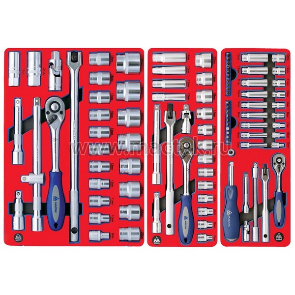Набор размещается в инструментальной тележке Мастак 521-06581B синего цвета с 6 выдвижными ящиками. Её корпус изготовлен методом сварки из листовой стали с усиленными ребрами жесткости. Поверх нанесено порошковое покрытие, стойкое к износу и ударным воздействиям. Общая допустимая нагрузка на тележку составляет 450 кг. Тележка оснащена тремя ящиками размером 580х406х75 мм каждый и тремя – размером 580х406х150 мм. Все ящики выдвижные и съемные, направляющие на роликовых подшипниках. Допустимая нагрузка на каждую полку составляет до 20 кг. Кроме этого каждый ящик укомплектован кнопочным замком, защитным ковриком из мягкой вспененной резины и биркой (полоска из картона + защитная прозрачная лента) для маркировки полки или описания комплектации.