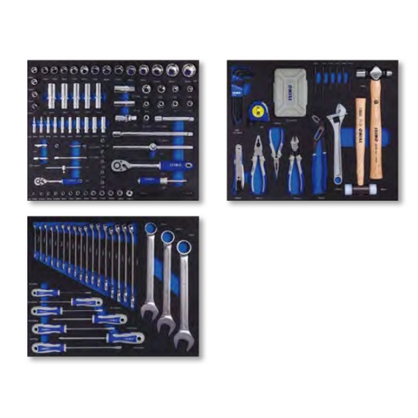Тележка оснащена 3 выдвижными ящиками внутренним размером 543x445x53 мм, двумя 543x445x118 мм и одним особо вместительным 543x445x184 мм. Все ящики с системой закрытия щелчок/фиксация. Инструменты размещены на ложементах из прочного и износостойкого материала.