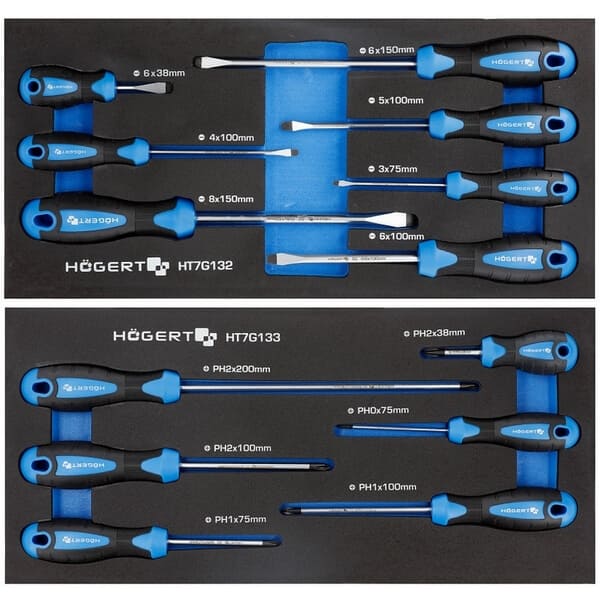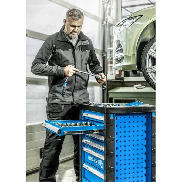 Расширенный по составу набор профессиональных ручных инструментов Hoegert HT7G056 в количестве 214 предметов, размещенный в передвижной тележке с 6 выдвижными ящиками, предназначен для создания стационарного или мобильного рабочего места в условиях автосервиса, СТО, автотранспортного предприятия, производства и т.д.