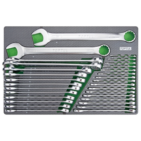 Набор стандартных комбинированных ключей TOPTUL, размещенный в ложементе, предназначен для укомплектования тележек, ящиков и верстаков в автосервисах, автомастерских, на производственных и иных предприятиях.