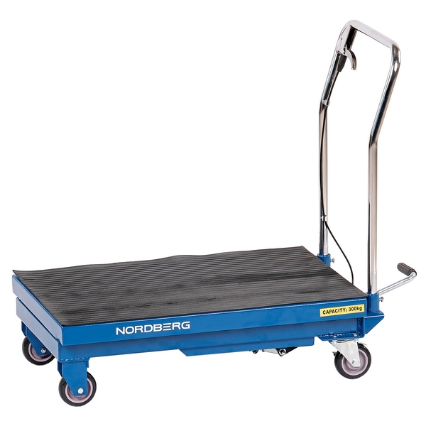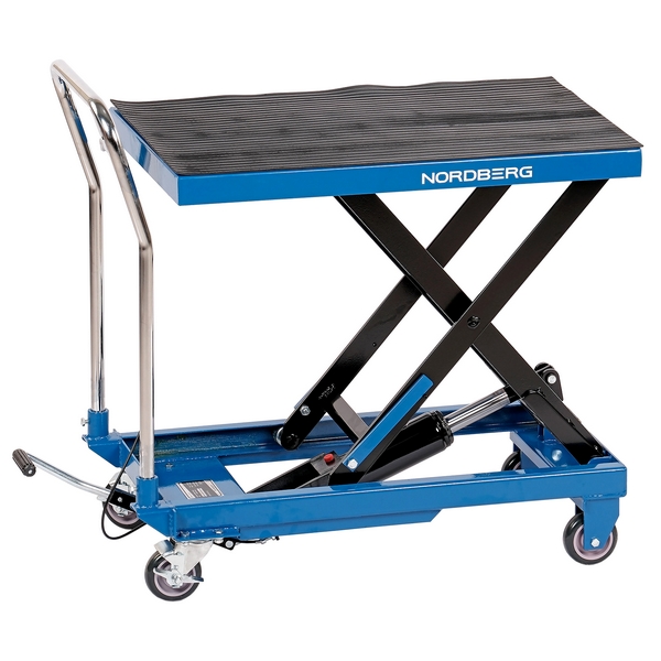 Гидравлический подъемный стол-тележка Nordberg грузоподъемностью 300 кг совмещает в себе функции стационарного подъемного стола для приподнимания различных грузов и ручной платформенной тележки для их перемещения по территории производственного цеха, авторемонтного предприятия, складского и других помещений.