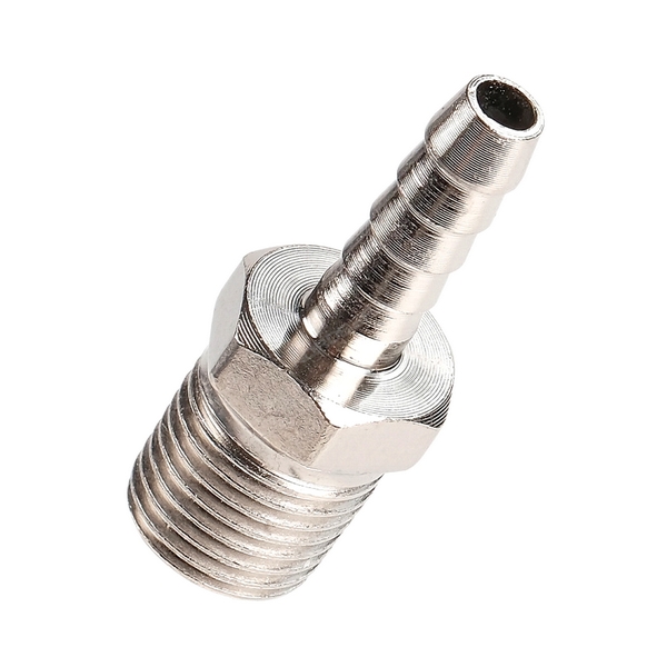 Металлический переходник Nordberg с наружной резьбой 1/4" на одном конце и елочкой диаметром 6 мм на другой стороне применяется в пневматических линиях.