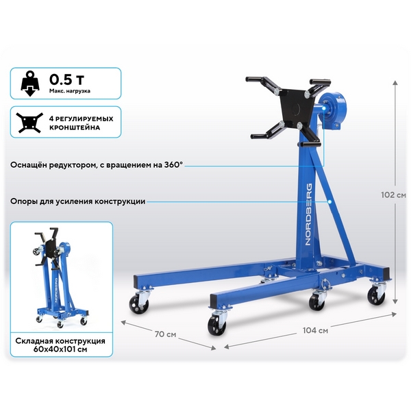 Передвижной стенд Nordberg предназначен для надежного, удобного и безопасного удержания, позиционирования и вращения автомобильных двигателей и иных агрегатов массой до 500 кг в процессе их ремонта, сборки-разборки, проведения диагностических и прочих работ. Кантователь применяется в автосервисах, автомастерских, на СТО и т.д.