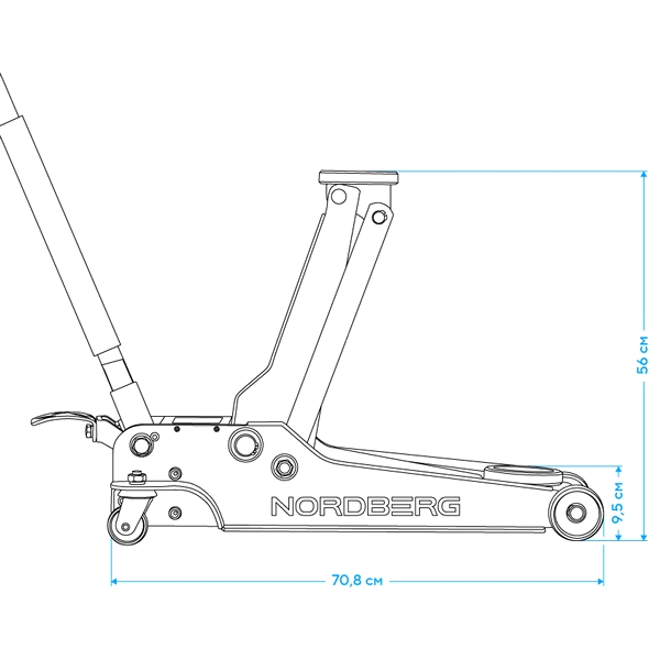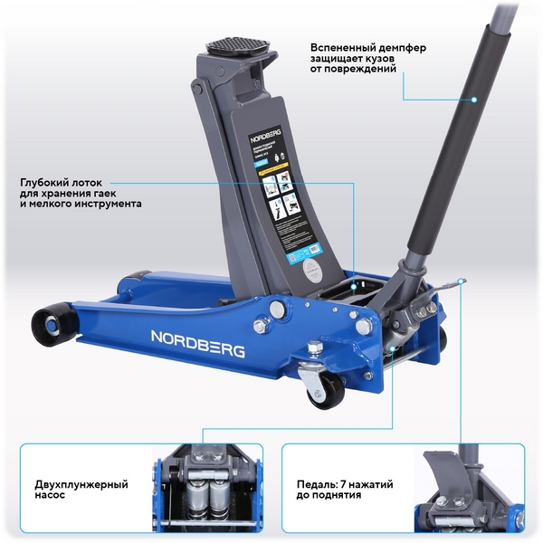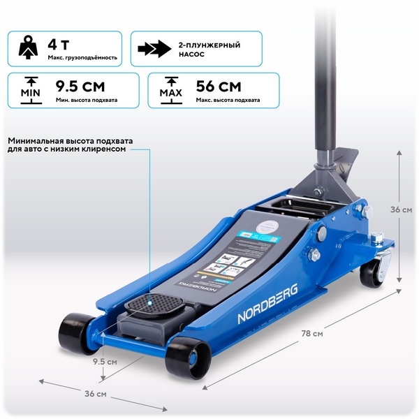 Гидравлический подкатной домкрат Nordberg грузоподъемностью 4 тонны предназначен для подъема и временного удержания на высоте легковых автомобилей, в том числе с малым дорожным просветом (клиренсом). Применяется в автосервисах, шиномонтажных мастерских, на СТО и т.д.