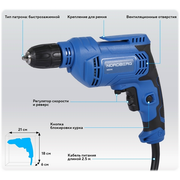 Электрическая безударная проводная дрель Nordberg предназначена для просверливания отверстий в металле, дереве, пластике, плитке и других твердых материалах. Применяется в мастерских, автосервисах, на строительных объектах, при сборке конструкций, для работ в быту и т.д.