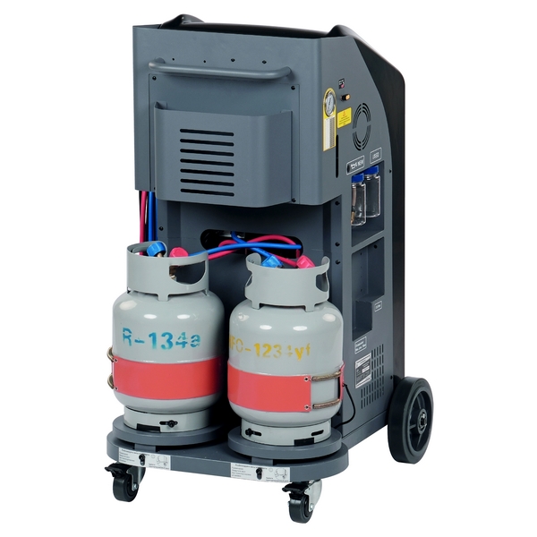 Установка оснащена двумя баллонами для хладагента, обеспечивая удобную работу с разными типами газов. Также имеются отдельные системы охлаждения для R-134a и HFO-1234yf с двумя конденсаторами и двумя вентиляторами и два комплекта переходников. Встроенная функция идентификации хладагента HFO-1234yf позволяет точно определить хладагент за 120 секунд.