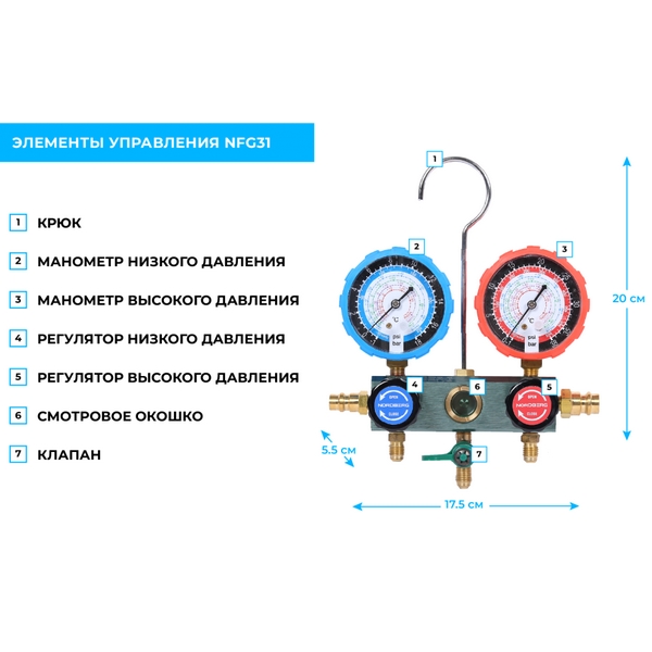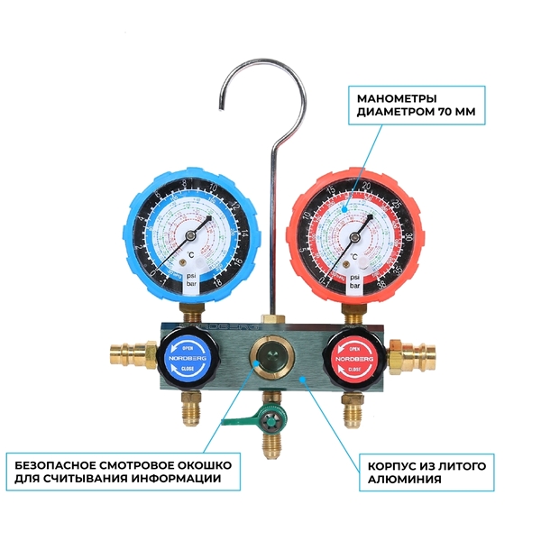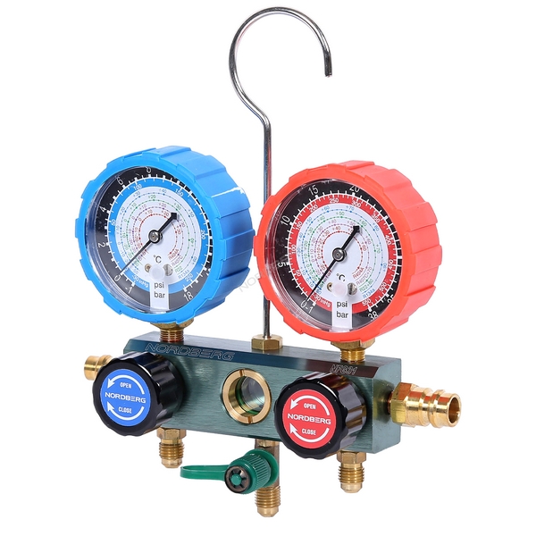 Механическая манометрическая станция Nordberg предназначена для точного измерения давления, обслуживания и настройки систем кондиционирования воздуха и холодильного оборудования, функционирующих на хладагентах R22, R134A, R404A и R407C.