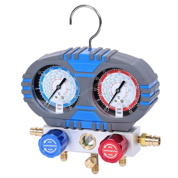 Механическая манометрическая станция Nordberg предназначена для точного измерения давления, обслуживания и настройки систем кондиционирования воздуха и холодильного оборудования, функционирующих на хладагентах R22, R134A, R404A и R410A.