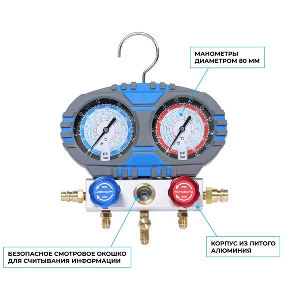 - манометры низкого (-1 – 35 бар) и высокого (-1 – 55 бар) давления диаметром по 80 мм облегчают контроль в системе;