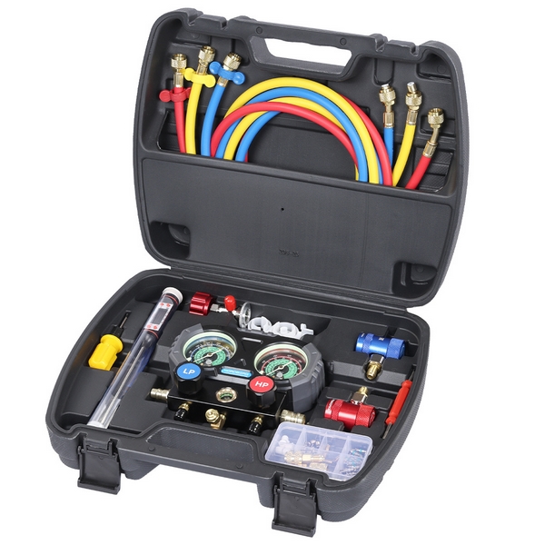 Манометрическая станция с набором принадлежностей Nordberg предназначена для контроля давления при вакуумировании и заправке холодильных установок и систем кондиционирования, работающих на хладагентах R134a, R410a, R407с и R22.