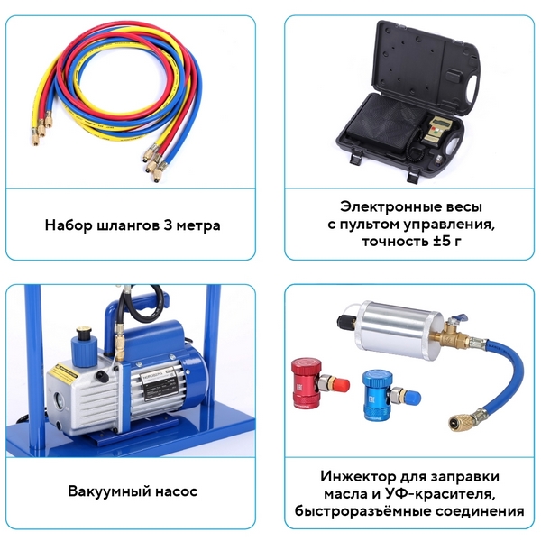 - в комплекте инжектор для заправки масла и УФ-красителя, а также набор шлангов с присоединительной резьбой 1/4" SAE F и БРС-переходников;