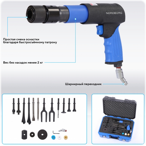 Пневматическое зубило Nordberg предназначено для выполнения ударно-режущих операций при обработке металла и других твердых материалов – вырубания болтов, удаления ржавчины, заклепок, окалины, заусенцев, демонтажа шаровых опор и т.д. Применяется в слесарных и реставрационных мастерских, на станциях кузовного ремонта, производствах и т.д.