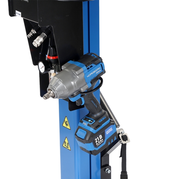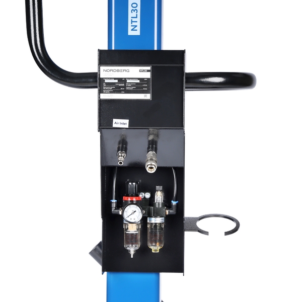 - пневматический привод (требуется подключение к линии сжатого воздуха 6–8 бар) обеспечивает быстрый и легкий подъем колес без физической нагрузки со стороны оператора;
