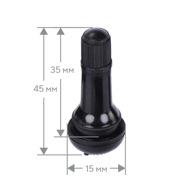 Корпус вентиля изготовлен из EPDM (этилен-пропилен-диенового каучука), обладающего высокой стойкостью к воздействию ультрафиолета, озона и других атмосферных факторов. Оснащен пластиковым колпачком черного цвета. Общая длина составляет 45 мм.