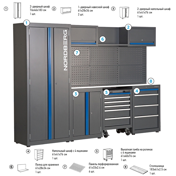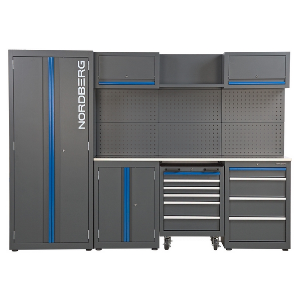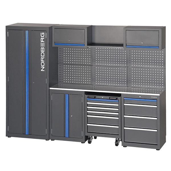 Модульный набор металлической мебели Nordberg представляет собой готовое решение для организации удобного и функционального рабочего места, а также упорядоченного хранения инструментов, оборудования и принадлежностей. Применяется в автосервисах, мастерских, на производственных предприятиях и т.д.