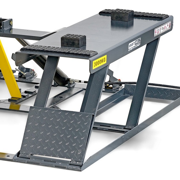 Электрогидравлический подъемник ножничного типа KraftWell грузоподъемностью 3000 кг и подъемом на максимальную высоту в 620 мм применяется для замены колес, а также проведения некоторых диагностических, кузовных и слесарных работ в условиях автосервисов, автомастерских, СТО и т.д.