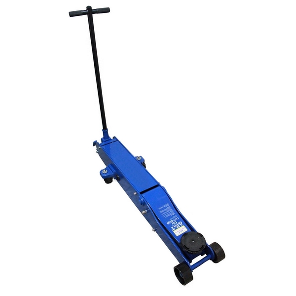 Подкатной гидравлический домкрат AE&T T32010 изготовлен из качественных материалов и комплектующих, конструкция подъемного устройства отличается прочностью и надежностью. Имеются педаль быстрого подъема и крупный удобный рычаг. Удлиненная форма позволяет разместить домкрат грузовой дальше от края кузова (рамы) транспортного средства. Максимальная высота подъема от уровня пола составляет 580 мм, подъем груза осуществляется плавно и без рывков. Устройство имеет 4 крепких колеса для перемещения по цеху и комплектуется резиновой опорой (пяткой).