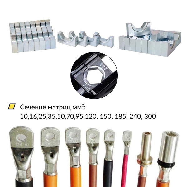 - в комплекте 12 матриц сечением 10, 16, 25, 35, 50, 70, 95, 120, 150, 185, 240 и 300 мм²;