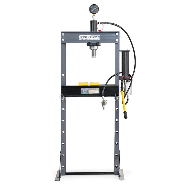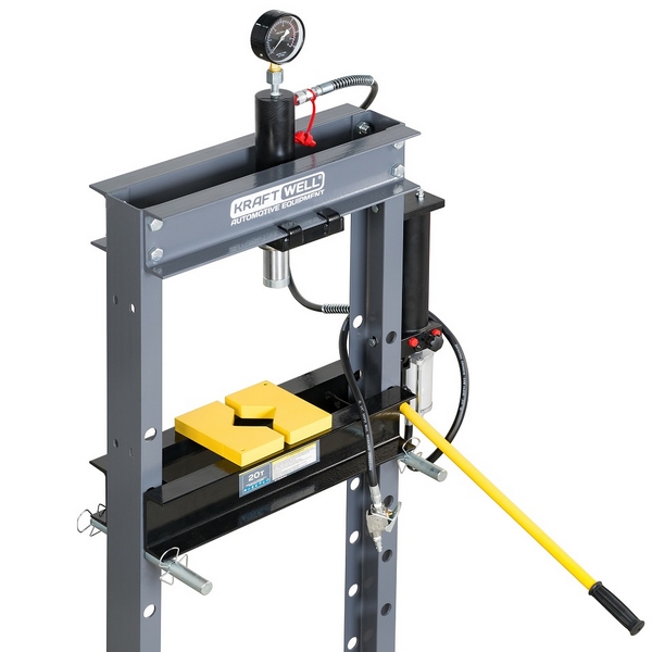 Гидравлический пресс напольного размещения, с ручным и пневматическим приводом Kraftwell, развивающий максимальное усилие 20 тонн, предназначен для запрессовки, выпрессовки, прошивки, правки и вытяжки деталей и заготовок. Применяется в автосервисах, слесарных мастерских, частных гаражах и т.д.