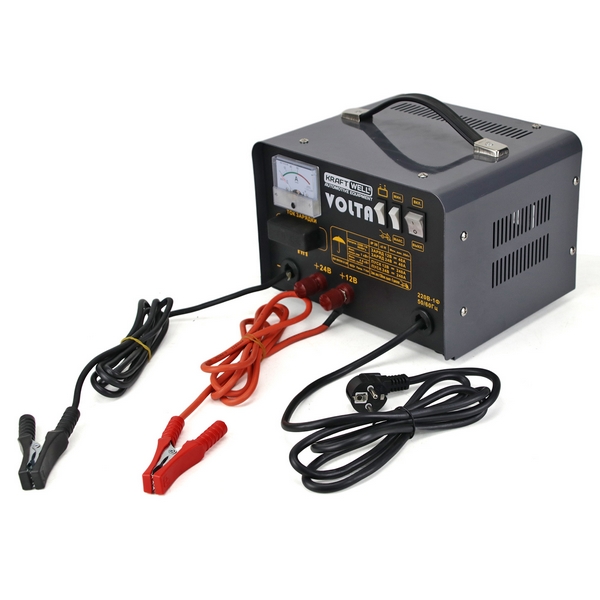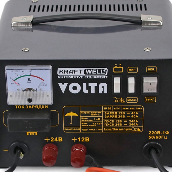 Переносное устройство KraftWell предназначено для зарядки свинцово-кислотных автомобильных аккумуляторов напряжением 12 или 24 В, а также для запуска двигателя транспортного средства при глубоко разряженной батарее. Применяется при обслуживании легковых автомобилей и коммерческой техники.