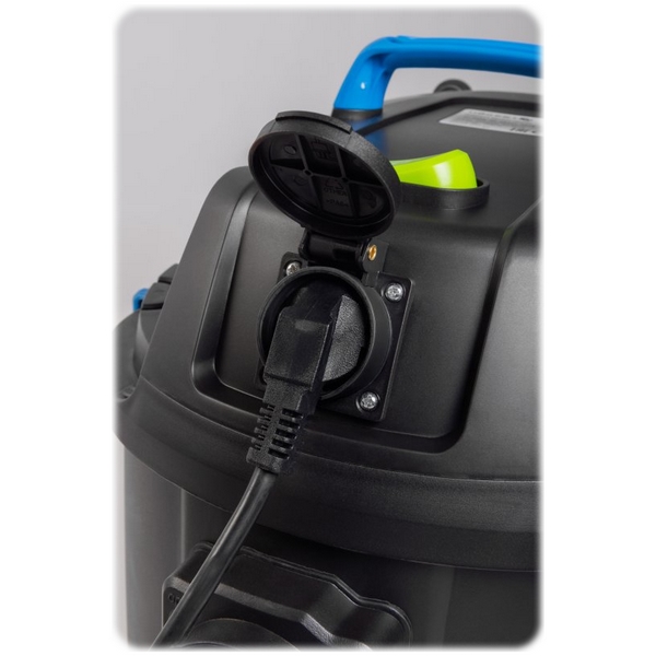 - пылесос оснащен встроенной розеткой, позволяющей подключать к нему проводные электроинструменты, в т.ч. с системой пылеудаления;