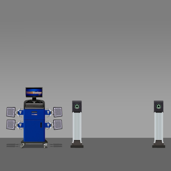 Стенд Техно Вектор 7 T7202M1A серии Aluminum сочетает в себе лаконичный дизайн с высокими потребительскими качествами. Система машинного зрения состоит из двух неподвижных камер с максимальным разрешением 1,3 Мп каждая, вмонтированных в напольные алюминиевые стойки небольшого размера. Такое решение позволяет организовать сквозной проезд автомобилей. Расстояние от камер до центра передних поворотных платформ составляет 1500–2500 мм (рекомендуемое расстояние составляет 2200 мм). Двухкамерная конфигурация идеально подходит для организации рабочего места на яме.
