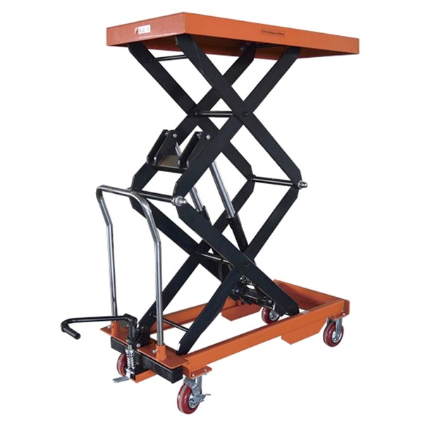 Платформенная тележка (стол) TOR с гидравлическим приводом двойного ножничного механизма представляет собой подъемно-транспортное средство для перевозки различных грузов и их подъема-опускания. Применяется в складских помещениях, на автотранспортных, ремонтных, производственных и иных предприятиях.
