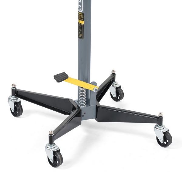 Трансмиссионная стойка KraftWell KRWTJ5 имеет ножной насос, хромированную поверхность гидроцилиндра, отсоединяемые вращающиеся колеса и основание. Стойка отличается пропорциональным опусканием, оснащена рукоятками для перемещения. Рабочая высота составляет 1000-1900 мм.