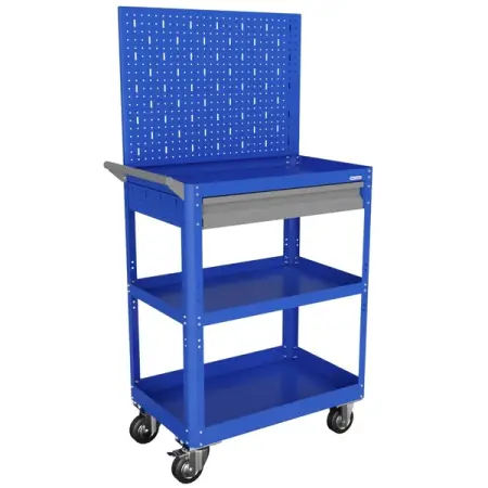 - помимо трех открытых полок данная модификация тележки оснащена выдвижным ящиком на шариковых телескопических направляющих и жестко закрепленной вертикальной перфорированной панелью для дополнительного размещения инструментов и аксессуаров (крючки и держатели в комплект не входят);
