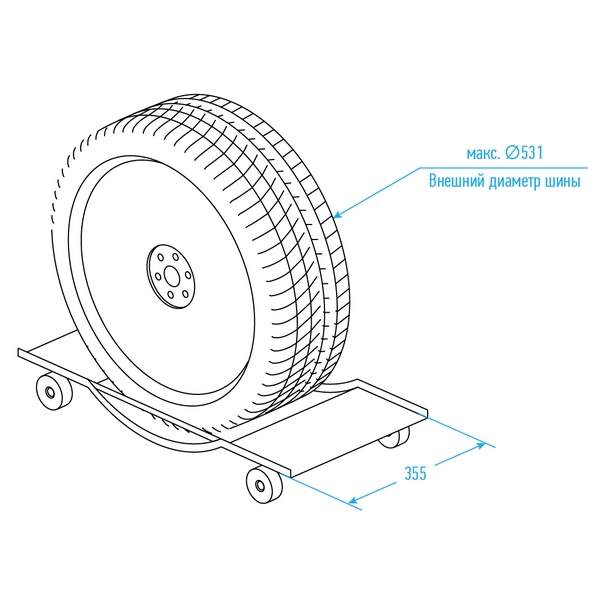 Тележка имеет специальный закругленный профиль под автомобильное колесо с бортиками и оснащена собственными прочными колесами. Грузоподъемность составляет 450 кг. Максимальная ширина колеса - 355 мм, максимальный диаметр колеса - 531 мм.