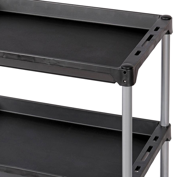 - 3 пластиковые полки размером 600x400 мм каждая и с высокими бортами для надежного размещения инструментов, деталей и мелочевки;