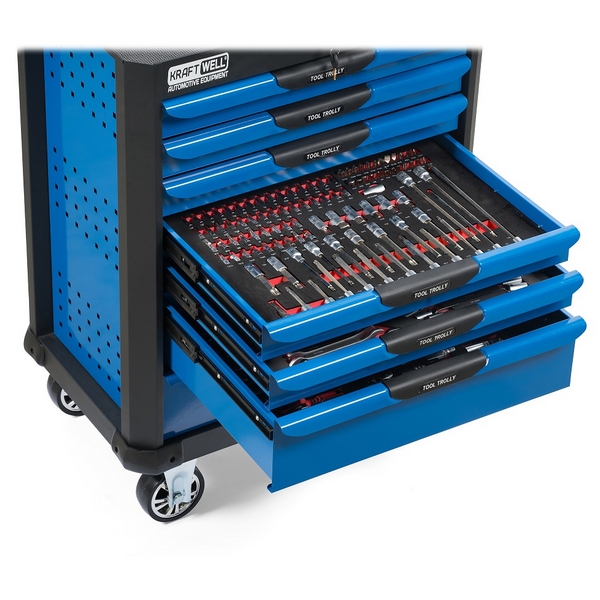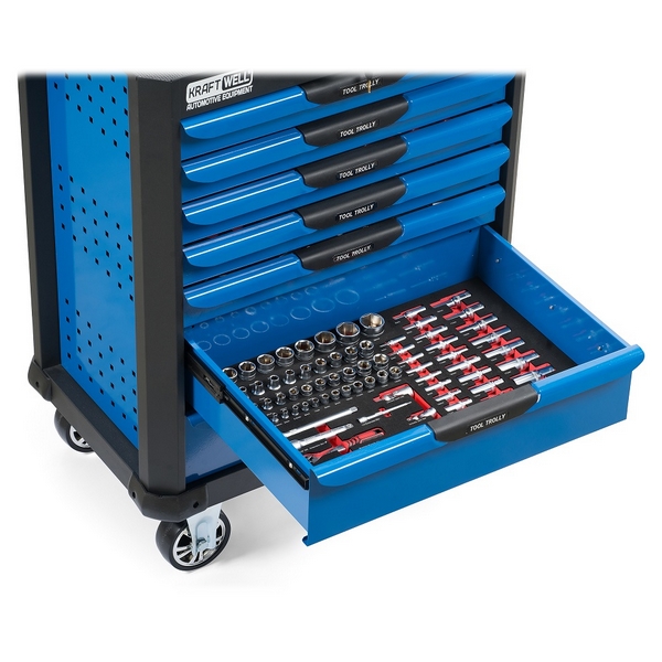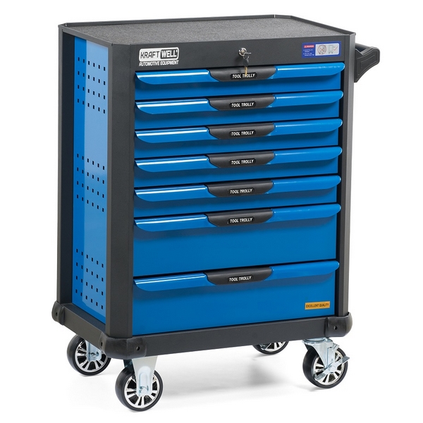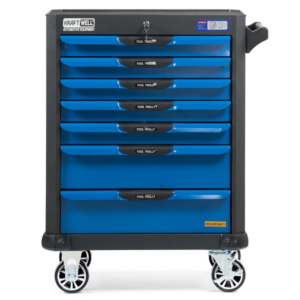 Инструментальная тележка синего цвета с 7 выдвижными ящиками KraftWell KRW-TTB предназначена для оборудования рабочих мест в автосервисах, слесарных мастерских, на СТО и других ремонтно-производственных предприятиях.