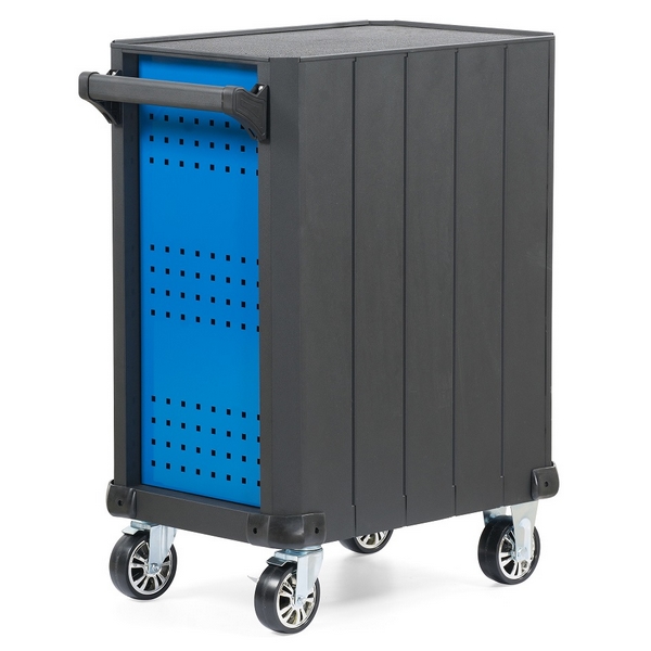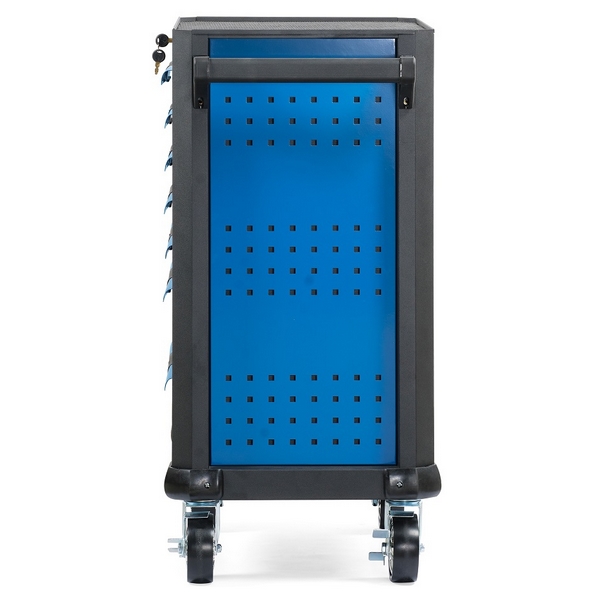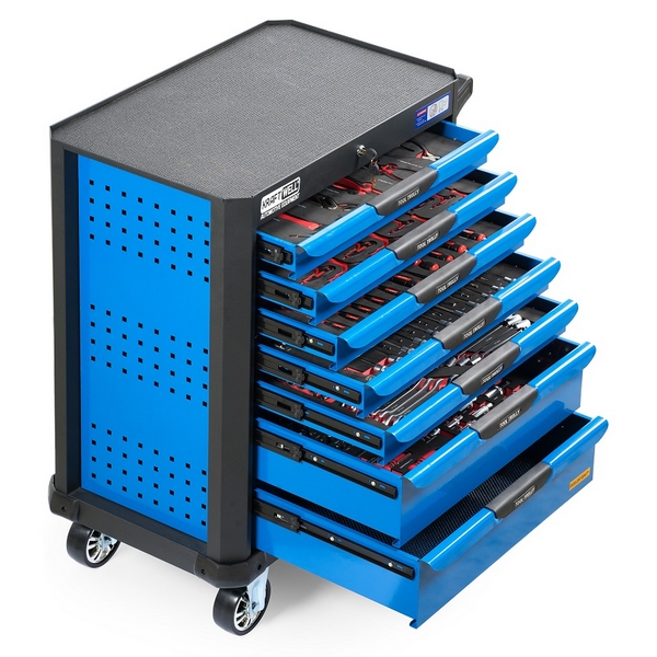 Инструментальная тележка изготовлена из прочной стали и покрыта порошковой краской. 7 выдвижных ящиков установлены на телескопических направляющих с механизмом фиксации, который не позволяет самопроизвольное открытие, а также с доводчиком для плавного закрытия.