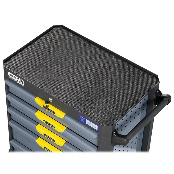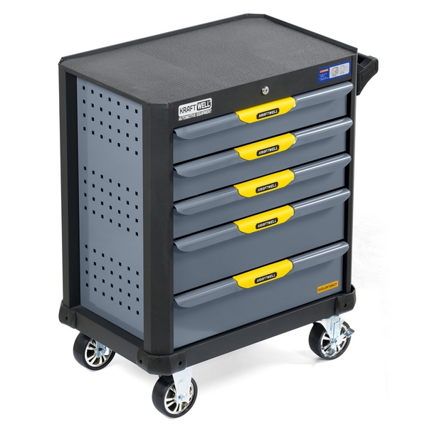 Тележка KraftWell с 5 выдвижными ящиками предназначена для размещения инструментов и принадлежностей с целью создания передвижного рабочего места в автосервисах, мастерских различного профиля, на СТО, производственных и иных предприятиях.